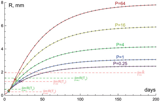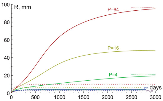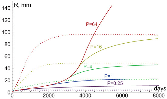 Tumor growth curves, produced by numerical simulations of the system of Equation (6) under different nutrient supply levels P and tissue hydraulic conductivity (solid lines) and (dashed lines). Dotted lines denote the limit values of tumor radii under and , . The simulation under and was stopped at mm, before approaching stationary state.