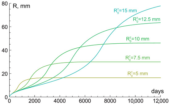 Tumor growth curves, produced by numerical simulations of the system of Equation (6) under nutrient supply level , tissue hydraulic conductivity and different values of initial radius of region of normal tissue, that surrounds tumor, .