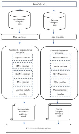 In this research, a Bayesian classifier, back propagation neural network classifier (BPNN classifier), radial basis function neural network classifier (RBFNN classifier), probabilistic neural network classifier (PNN classifier) and quantum particle classifier are applied as weak classifiers for AdaBoost. In the data pre-process step, we normalize all the financial data as 0–1. After training the AdaBoost classifier, the semiconductor enterprise predictive result and the tourism enterprise predictive result were acquired.