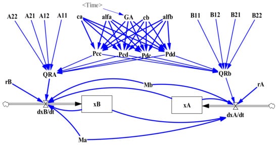Figure 2 shows the framework of system dynamic simulations for different scenarios. This system includes two state variables  and , two flow rate variables  and , sixteen external variables, six intermediate variables, and one shadow variable (varying quantum entanglement parameter); start time INITIALTIME = 0, system simulation end time FINAL TIME = 60; simulation time step, TIME STEP = 1, and time unit generation. Here, all initial values meet the Stability conditions for competitive coexistence (Table 7). In addition, to further investigate the impacts of higher payoffs (higher returns) on game outcomes, it is assumed that player A’s payoffs exceed player B’s payoffs. Entanglement parameter (), as a variable representing the entanglement intensity of interactive strategy, can be calculated as Equation (18), based on the aforementioned calculation steps and scenario setting and with its value meeting the game equilibrium and stable conditions for competition and cooperation coexistence. Thus,  are set in the simulations to disclose whether entanglement intensity affects the evolution trajectories of player population sizes and delineate the characteristics of those population size trajectories.