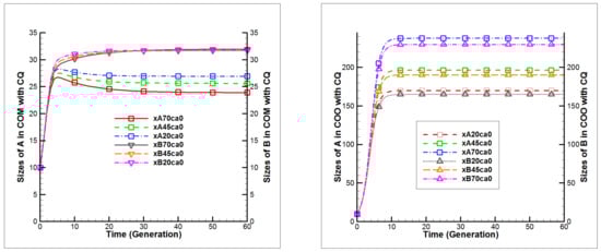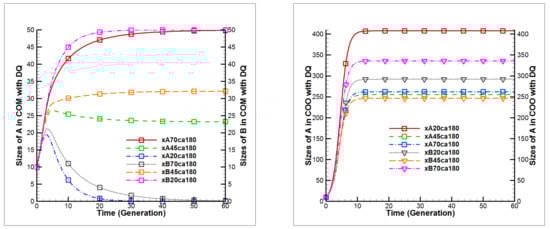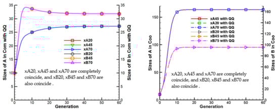 Figure 3 shows that, in case 1, player population sizes first rapidly increase and then evolve into a stable state whether the coexistence is competitive or cooperative in . First, the population size evolution trajectories, whether for competitive or cooperative coexistence, are the same despite different  values. Second, in theory, player A with higher payoffs (higher returns) generally has more power than player B and thus the final and stable population size for player A is always larger than for player B whether the coexistence is cooperative or competitive. Meanwhile, the final population sizes for players in cooperative coexistence are larger than the initial environment capacity (Ma = 50, Mb = 50). However, population sizes for players in competitive coexistence are always smaller than the initial environment capacity (Ma = 50, Mb = 50).