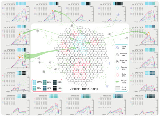 - Soufyane Benyoucef, A.; Chouder, A.; Kara, K.; Silvestre, S. Artificial bee colony based algorithm for maximum power point tracking (MPPT) for PV systems operating under partial shaded conditions. Appl. Soft Comput. 2015, 32, 38–48. [Google Scholar] [CrossRef] [Green Version]