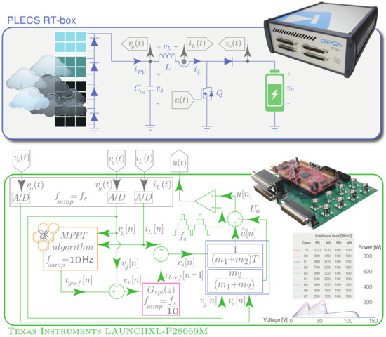 - Experimental validation in a low-cost controller: The presented MPPT algorithm and the double loop controller of the dc–dc boost converter were implemented in a commercial low-cost digital signal controller (DSC). This way, the MPPT algorithm was tested in realistic operation conditions, unlike many of the proposed techniques presented in the literature that just have been verified in simulations or experimentally with expensive control platforms, as shown in Table 1.