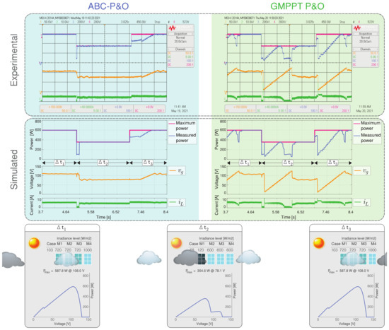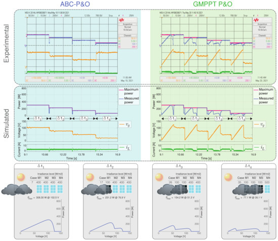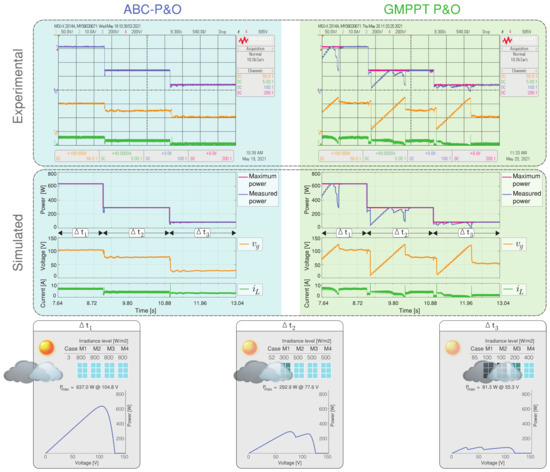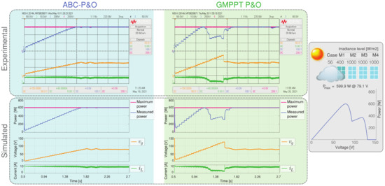 - MPPT algorithm decoupling dynamics from the control loops: Many of the MPPT techniques listed in Table 1 directly regulate the duty cycle, which produces oscillations during every update of the duty cycle in the converter’s voltage and current waveforms. Therefore, an appropriate stabilization time is required before using the algorithm again. This problem can be fixed by decoupling the dynamics of the MPPT and the control of the converter by employing a fast current loop, as in the presented ABC-P&O algorithm. This way, the MPPT reference output corresponds to a voltage instead of a duty cycle, avoiding the steady-state oscillations.