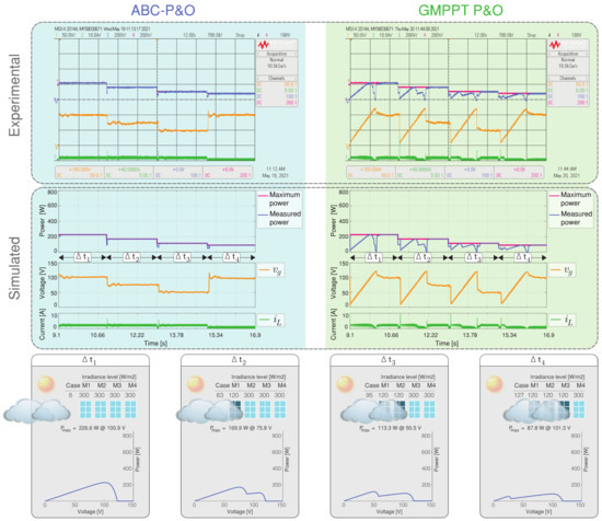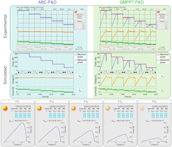 - A complete experimental validation: The MPPT method was tested by simulation and hardware-in-the-loop (HIL) to prove its viability and superior robustness to obtain the GMPP of the PV system in challenge tests, which included different dynamic partial shading changes, irradiance variations, and start-up tests. It also included comparing the proposed method with a conventional P&O method, with a voltage scan across the entire voltage range for the PV system to ensure always the GMPPT [70].
