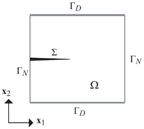 Let us consider crack growth in a thin panel as shown in Figure 1. Here, we focus on the so-called mode 3 crack, in which the displacement of the panel is in the direction perpendicular to the panel. Thus, we treat the problem as two-dimensional and denote the displacement at a point by a scalar variable . We denote the region by , its boundary by , and the crack, which is modeled as a curve on , by . Hence, is discontinuous across . In the example shown in Figure 1, the Dirichlet boundary condition is imposed on , while the Neumann boundary condition is imposed on .