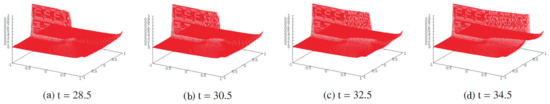 The time evolution of for this problem is shown in Figure 5. Here, the mesh size is and the period of simulation is from to . Until , does not change significantly and only along the line connecting and , showing that the crack exists only in this region. As time passes, the region of extends to the right edge of the region, meaning that the panel has broken into two pieces. The evolution of for other initial conditions, which was computed using a FreeFEM code, is shown in Appendix A.