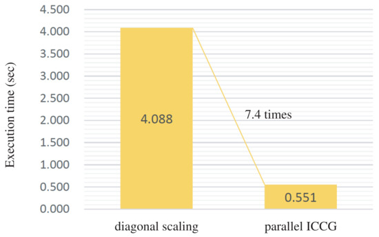 Finally, we compare the execution time of our solver with that of the original solver in Figure 17 and Figure 18. Thanks to the use of the IC(0) preconditioner with multi-color ordering, our solver attains an acceleration of 6.1 and 8.3 for the and meshes, respectively.