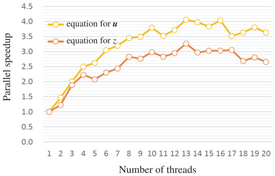 We next evaluated the parallel acceleration of our linear equation solver by varying the number of threads from 1 to 10. The results for and meshes are shown in Figure 6 and Figure 7, respectively. The number of blocks in the and directions, which we denote by and , are shown in Table 2. These numbers were determined experimentally to achieve the best performance in each case, under the condition that equals four times the number of threads. It can be seen that the solution of the linear simultaneous equations for and z achieves an acceleration of up to 5 and 4 times, respectively, using 10 threads.