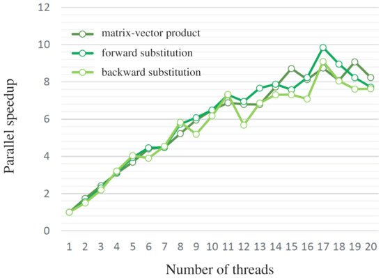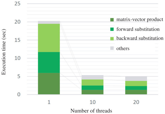 The parallel acceleration of our solver for the and meshes is shown in Figure 11 and Figure 12, respectively. For the latter mesh, the solution of the linear system for and z was accelerated by up to 6.7 and 4.4 times, respectively. We also show the acceleration of each component of our solver and the breakdown of the execution time in Figure 13, Figure 14, Figure 15 and Figure 16. Our solver consists of a matrix-vector product, forward and backward substitutions corresponding to the application of and , respectively, and other parts such as vector additions, dot products and computation of norms. Figure 13 and Figure 15 show that the matrix-vector product and the forward/backward substitutions are reasonably well accelerated, but Figure 14 and Figure 16 reveal that the other parts are not accelerated at all. The latter are difficult to parallelize efficiently because they are vector operations with small computational work and a relatively large amount of data transfer. If this part could be improved, our solver could achieve further acceleration.