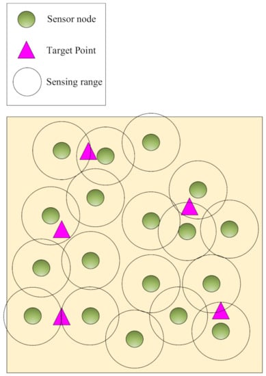 Figure 1. Area coverage.Partial coverageIn this coverage, the area is partially covered to guarantee the efficient and acceptable coverage degree according to the desired application. In partial coverage, the goal is to cover the P percentage of the area. This coverage type is also called P-coverage. Partial coverage can save energy of sensor nodes and increase network lifetime. Moreover, it requires a less number of sensor nodes compared to the full coverage [18]. For example, it is sufficient to achieve 80% area coverage in applications, such as environment monitoring, calculating the environment temperature, and forest fire detection during rainy seasons.Full coverageWhen it is necessary to cover the entire area, the full coverage is applied. In the full coverage, any point of RoI should be monitored by at least one sensor node. Full area coverage is very costly because it requires a large number of sensor nodes [19]. In addition, the coverage degree is defined based on the application requirements. In some applications, simple coverage is required, i.e., one sensor node is sufficient to cover each point of RoI. However, in other applications, at least k sensor nodes () must cover any point of RoI. In this case, the network is fault-tolerant, and, if a sensor node dies, then the network will continue its normal performance with the sensor nodes; however, this is impossible in simple coverage. - Point coverage: In this coverage, it is sufficient to monitor some points of RoI depending on the application. It has a low-cost network deployment because fewer sensor nodes are used to cover the target points [20,21]. Figure 2 shows the point coverage.