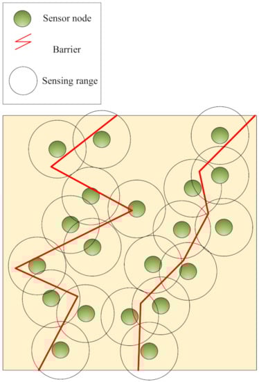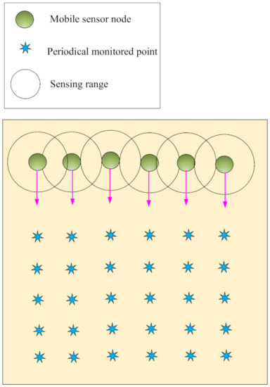 Figure 3. Barrier coverage. - Sweep coverage: In this coverage, some points of RoI must be monitored periodically, i.e., target points are covered at a certain time interval. Therefore, it is better to cover the target points using a minimum number of mobile sensor nodes [19,22]. Sweep coverage should not be done using static sensor nodes because they have weak performance and additional overhead. This coverage is illustrated in Figure 4.