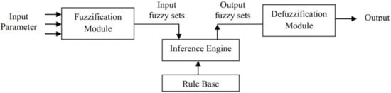 A fuzzy system has four main modules: fuzzification, defuzzification, a fuzzy rule base, and a fuzzy inference engine. A fuzzy system is shown in Figure 5. The fuzzification module maps the system inputs to the fuzzy sets and determines their fuzzy membership degree. These fuzzy values are simulated using an inference engine that uses fuzzy rules stored as IF-THEN rules. The results of the inference system are in the fuzzy form, which are transformed into crisp values using a defuzzification module, such as an averaging scheme and the centroid scheme [42].