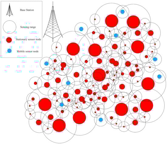 In the proposed method, the wireless sensor network includes N heterogeneous sensor nodes. Sensor nodes are different in terms of energy source, sensing range, and communication range. These nodes are randomly scattered in the network environment. Each sensor node (where ) knows its spatial coordinates in the network at any time using a positioning system, like GPS.