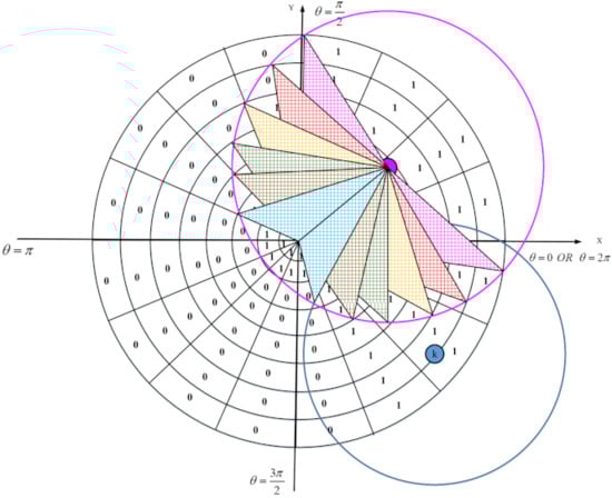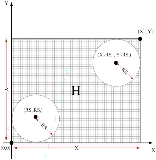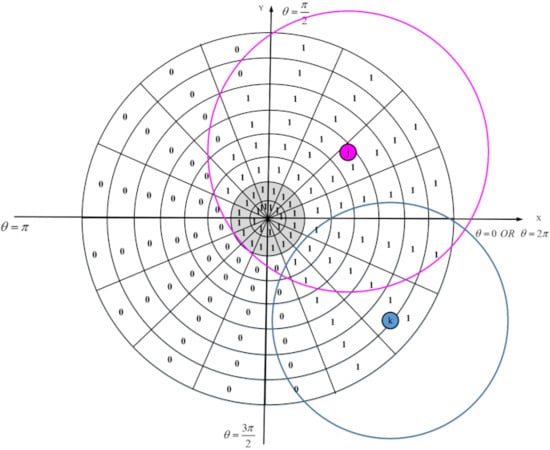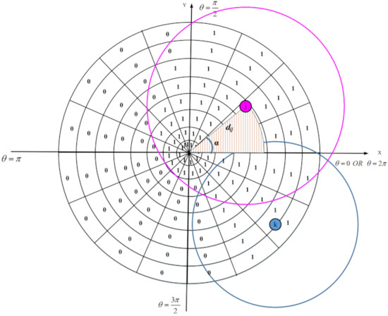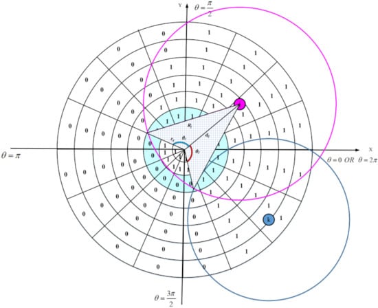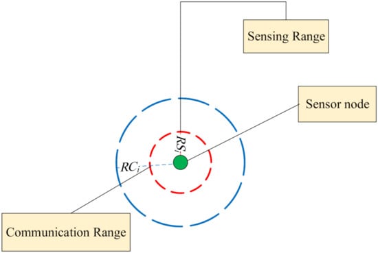 In the proposed scheme, we apply the binary sensing model ( model). This model is shown in Figure 7. In this model, each sensor node can sense a circle with radius . Assume that is a point in RoI. According to this model, if the Euclidean distance between and P is less than , then senses this point because P is within its sensing range. Otherwise, cannot sense P. This is stated in Equation (7):