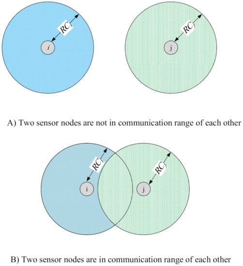The communication unit consumes the most energy compared to other units, because it is responsible for sending and receiving data. Based on energy model, if the sensor node transmits k bits to the sensor node , where the distance between them is equal to d. Then, the energy consumed by the sensor node is calculated using Equation (5):