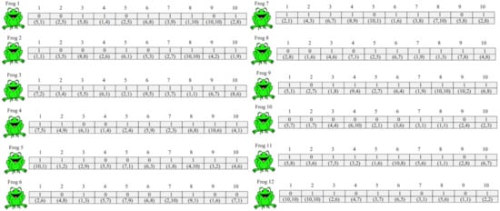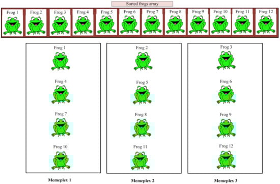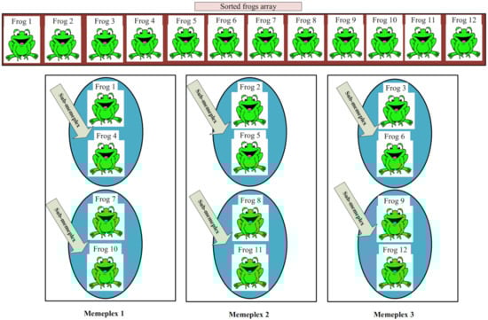 In the local search process, each memeplex is partitioned into a number of sub-memeplexes. Then, frogs are evaluated based on a fitness function and are sorted in descending order according to their fitness values to determine the best and worst frogs in each the sub-memeplex, which are described as and , respectively. Then, the position of the worst frog () is improved toward the best frog () using Equation (1):