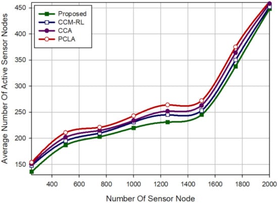 Comparison of different methods in terms of the average number of active sensor nodes.