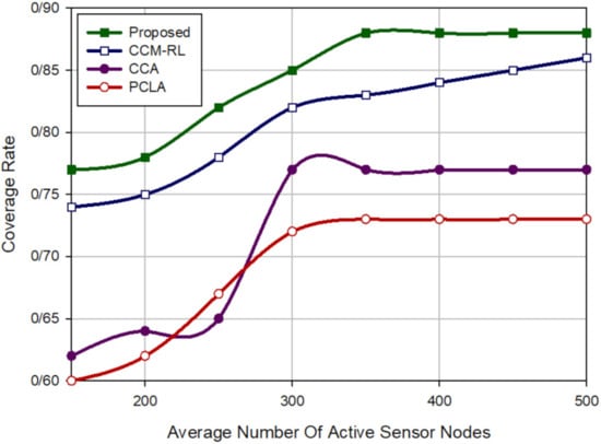 Afterward, if the number of active sensor nodes increases, this coverage rate will be constant. CCM-RL [30] has a weaker function than our method. In this scheme, the coverage rate is not constant and rises with increasing the number of active sensor nodes. In the CCA [31] method, when the number of active nodes is 300, the coverage rate is fixed and equal to 77%. PCLA [32] has the weakest performance compared to other schemes in terms of coverage rate. When the number of active nodes in the network is 350, PCLA [32] can achieve a coverage rate equal to 73%.