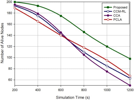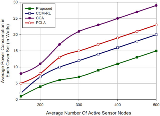 On average, it improves the network lifetime by 21.45%, 24.43% and 20.41% compared with CCM-RL [30], CCA [31] and PCLA [32], respectively. This shows that our method can distribute the energy consumption evenly between sensor nodes in the network. As the proposed method takes into account the residual energy of the sensor nodes in the scheduling mechanism based on fuzzy logic.