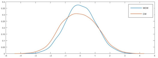 Our WCW test can be viewed as a simple modification of the CW test. As noticed by West (1996) [2], in the context of nested models, the CW core statistic becomes degenerate under the null hypothesis of equal predictive ability. Our suggestion is to introduce an independent random variable with a “small” variance in the core statistic. This random variable prevents our test from becoming degenerate under the null hypothesis, keeps the asymptotic distribution centered around zero, and eliminates the autocorrelation structure of the core statistic at the population level. While West’s (1996) [2] asymptotic theory does not apply for CW (as it does not meet the full rank condition), it does apply for our test (as the variance of our test statistic remains positive under the null hypothesis). In this sense, our approach not only prevents our test from becoming degenerate, but also ensures asymptotic normality relying on West’s (1996) [2] results. In a nutshell, there are two key differences between CW and our test. Firstly, our test is asymptotically normal, while CW is not. Secondly, our simulations reveal that WCW is better sized than CW, especially at long forecasting horizons.