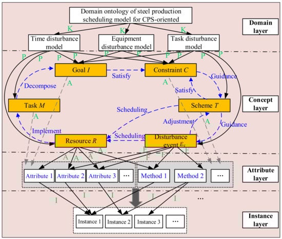 The above-selected concepts and defined attributes can describe the domain ontology of the steel production scheduling model in the CPS environment. As shown in Figure 4, it is a four-level domain ontology model of steel CPS production scheduling, including domain layer, concept layer, attribute layer, and instance layer. The domain layer represents the top-level concepts in the field. The concepts with inheritance and partial relationship are represented on the concept layer. The concepts, related attribute information, and methods play the role of description at the attribute layer. The instance generated by the combination of method and attribute is in the instance layer. The relationship between these concepts is that the task guides the steel production scheduling problem. Task (R) is decomposed into multiple subtasks and activities characterized by goal (I). When constraint (C) is satisfied, a guidance scheme (T) is generated to realize multi-objective optimization. Then according to the disturbance event () adjust the scheduling scheme(T) and optimize the resource (R) allocation to make the production go smoothly.