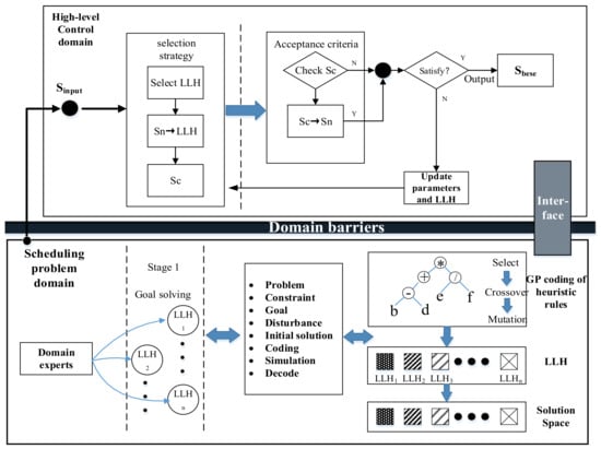 The high-level strategy is designed to select the low-level heuristic (low-level heuristic, LLH) in the upper control domain. The LLH is represented and generated by GP. The information is transmitted through the preset interface in the domain barrier so that the high-level strategy and the LLH are independent of each other. On the one hand, the high-level strategy transfers scheduling strategy and other information through the low-level operator and indirectly calls the LLH for the solution; on the other hand, in the process of solving, the LLH returns the quality of the solution and the operator execution time to the high-level strategy to guide the generation of operator scheduling strategy.