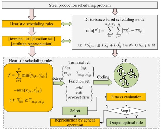 (3) A hyper-heuristic algorithm of GP-HH is proposed. The framework of the algorithm and the composition of the heuristic scheduling method are described. A greedy strategy is used in the high-level domain to drive all bottom heuristic operators to fix the number. An automatic generation framework of heuristic scheduling rules based on GP is proposed to deal with different disturbance scenarios in the steel production scheduling environment. Finally, through a case study, the universality and effectiveness of the algorithm are verified.