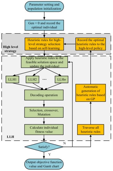 The hyper-heuristic algorithm is a new optimization method. It is an automatic method for selecting or generating heuristics to solve computational search problems. It can solve cross problem areas [21]. It is widely used in vehicle routing [22], nurse scheduling [23], reinforcement learning [24], production scheduling [25,26] and has great application potential.