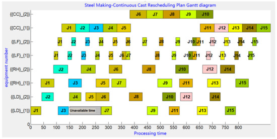 This experiment is programmed with Visual Studio C++ 2010. The running environment is Windows10, and the memory is 8 GB and CPU 2.6 GHz. Each case is run 10 times, and the results are averaged. Enable the scheduling model based on equipment disturbance and use GP–HH to solve the rescheduling plan. The rescheduling schedule plan is shown in Table 6. The rescheduling Gantt chart is shown in Figure 10.