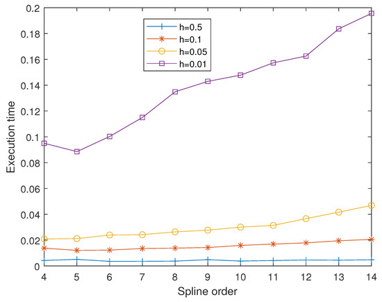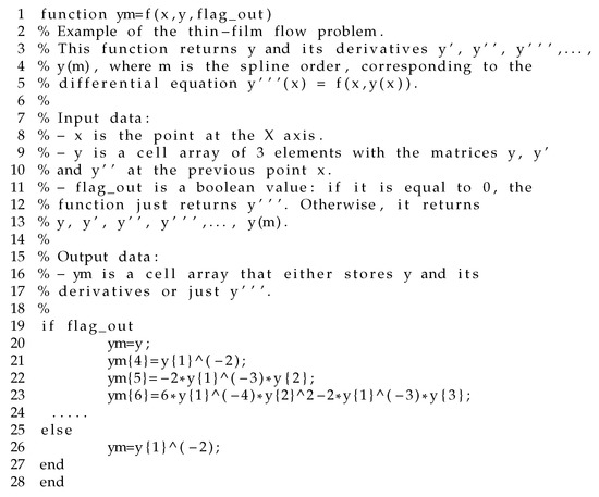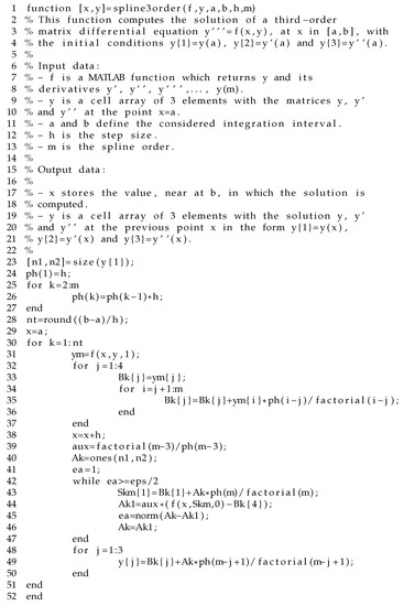 Theorem 1. Take the third-order matrix differential equation expressed in (4) and the Lipschitz constant L described in (6). If the interval is partitioned as in (7) by considering a step size h such as:then the matrix spline of order , s being the order of the differentiability class of the function f, is of class , and it can be defined as in (18) for each subinterval , . If an analysis similar to the one performed in [