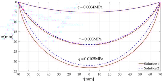 13], all need the closed-form solution of a circular membrane subjected to uniform normal loading due to the fact that all of these circular membranes are actually subjected to gas pressure loading rather than uniform transverse loading. As has been described above, however, the opposite is true in the existing literature, where there are far more of the closed-form solutions suitable for uniform transverse loading than the closed-form solutions suitable for uniform normal loading. In particular, the calculation accuracy of the existing closed-form solutions suitable for uniform transverse loading has been greatly improved, while the calculation accuracy of the existing closed-form solutions for uniform normal loading [