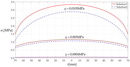 q = 0.0105 MPa, where solution 1 refers to the solution presented in this paper and solution 2 refers to the solution presented in Shi et al. [