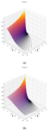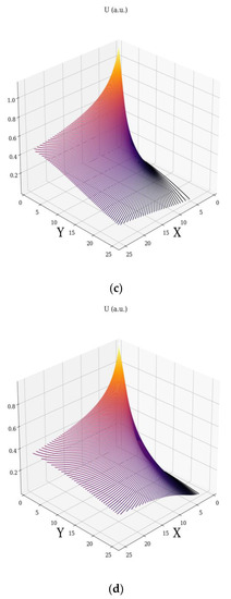 Any of the above relations describe the non-linear character of the velocity fields. This character can be explained through the fractal soliton (i.e., soliton depending on scale resolution) for the velocity field across the Ox axis, respectively “mixtures” of fractal soliton-fractal kink (i.e., kink dependent on scale resolution), for the velocity fields across the Oy axis. The specificities in the complex fluid dynamics are “explained” in Figure 1a–d and Figure 2a–d. Details on the soliton, kink, and other classical non-linear solutions are given in [10,11].
