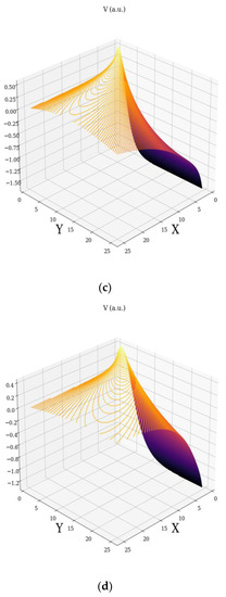 The velocity fields (23) and (24) induce the fractal minimal vortex (Figure 3a–d).