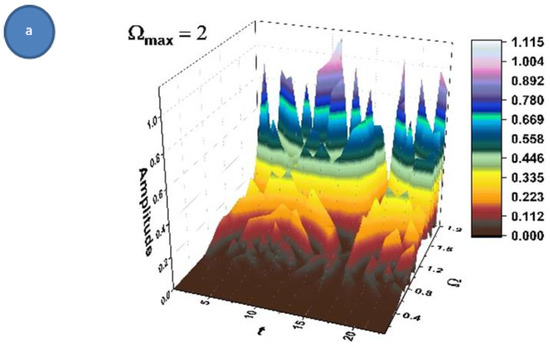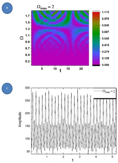 Therefore, space-time “synchronization modes” in phase and amplitude of the complex fluid structural units imply group invariances of a type. Then, period doubling emerges as a natural behavior in the complex fluid dynamics (see Figure 4a–c where , and at various scale resolutions, given by means of the maximum value of , i.e.,).