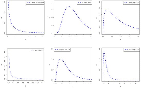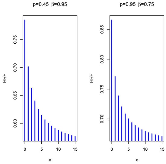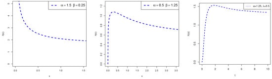 Figure 2 shows the plots of the HRF for some values of the parameters and . It is evident that the HRF can be decreasing or upside-down shaped. Further, it can be seen that the HRF converges to for large values of x (see Equation (10)).