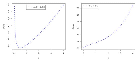 Recently, Lando et al. [15] discussed the problem of examining aging forms of the lifetime in the so-called k-out-n systems. Such systems are of practical interest in engineering reliability. Notable, among the four classes of probability distribution function they considered, they showed that the class identified by the convexity of the OF, say ( ), is the widest class. Additionally, if and only if the quotient between the HRF and the RF, i.e., , is an increasing function. Obviously, if h is an increasing function, then is also an increasing function. In this subsection, we study the OF of the EBuH distribution. Unfortunately, the HRF of the EBuH distribution (as shown in Proposition 2) can be either decreasing or upside-down, and hence the CDF of the EBuH does not belong to . In the following proposition, we show that can be either increasing or bathtub-shaped.