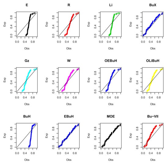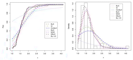 The first data set refers to strengths of glass fibers [16]. The data are: 1.014, 1.081, 1.082, 1.185,1.223, 1.248, 1.267, 1.271, 1.272, 1.275, 1.276, 1.278, 1.286, 1.288, 1.292, 1.304, 1.306, 1.355, 1.361, 1.364, 1.379, 1.409, 1.426, 1.459, 1.460, 1.476, 1.481, 1.484, 1.501, 1.506, 1.524, 1.526, 1.535, 1.541, 1.568, 1.579, 1.581, 1.591, 1.593, 1.602, 1.666, 1.670, 1.684, 1.691, 1.704, 1.731, 1.735, 1.747, 1.748, 1.757, 1.800, 1.806, 1.867, 1.876, 1.878, 1.910, 1.916, 1.972, 2.012, 2.456, 2.592, 3.197, 4.121. The EBuH distribution is compared with some continuous rival models, namely the exponential (E), Rayleigh (R), Lindley (Li), Burr X (BuX) [17], Gompertz (Gz), Weibull (W), odd exponentiated Burr–Hatke (OEBuH), odd Lindley Burr–Hatke (OLiBuH), Burr VII (Bu-VII), Marshall–Olkin exponential (MOE) [18] and BuH.