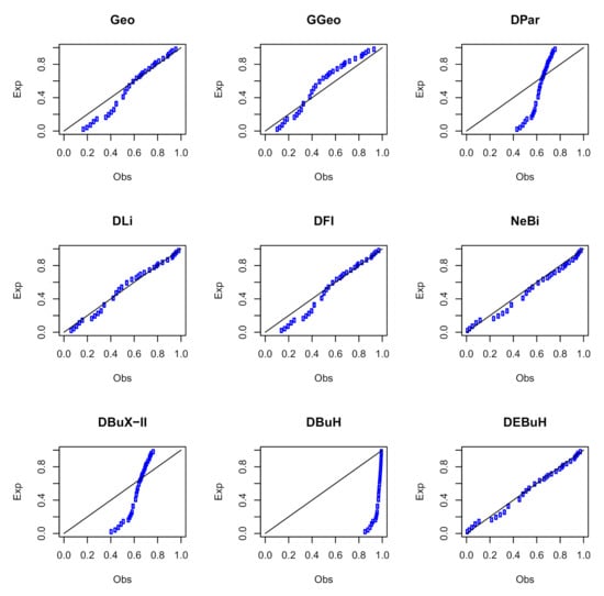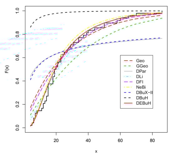 Now, we check the flexibility of the DEBuH distribution using a real data set, which refers to final mathematics examination marks of 48 slow space students in the Indian Institute of Technology at Kanpur [19]. The data are: 29, 25, 50, 15, 13, 27, 15, 18, 7, 7, 8, 19, 12, 18, 5, 21, 15, 86, 21, 15, 14, 39, 15, 14, 70, 44, 6, 23, 58, 19, 50, 23, 11, 6, 34, 18, 28, 34, 12, 37, 4, 60, 20, 23, 40, 65, 19, 31. The DEBuH distribution is compared with some discrete rival models called the Geometric (Geo), generalized geometric (GGeo), discrete Pareto (DPar), discrete Lindley (DLi), discrete flexible one parameter [20] (DFI), negative Binomial (NeBi), discrete Burr X type II (DBuX-II), and discrete Burr–Hatke (DBuH).