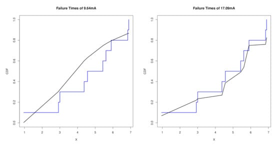 For this purpose, the K-S distance and the corresponding p-value are obtained for each stress level and displayed in Table 11. It is observed from Table 11 that the EBuH distribution provides acceptable fit to the CSALT data. Figure 12 presents the empirical and the estimated EBuH CDF for the two stress levels, indicating that the EBuH distribution is a good choice for modeling this data set. The different estimates of the unknown parameters and MTTF at each stress level, estimated shape parameter, and MTTF at normal use conditions are given by , , , , , , , , and .