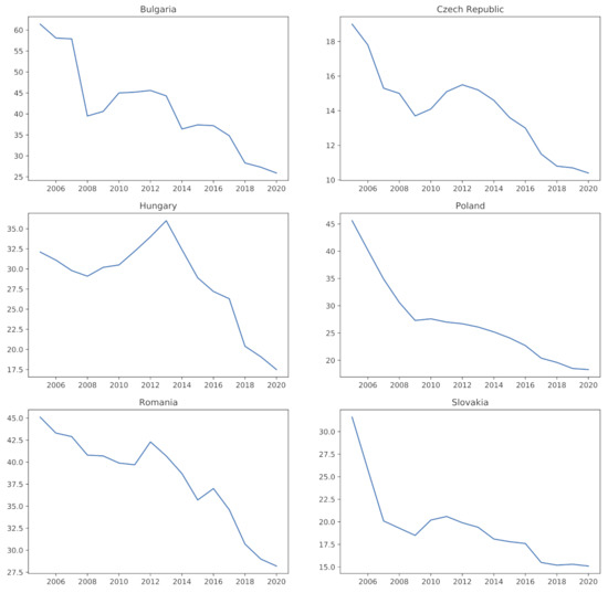 We can observe a decreasing trend for all six countries, as the EU is constantly expanding their legal support to stimulate economic activity and to reduce the risks of poverty and social exclusion for the population [28].