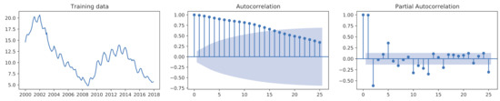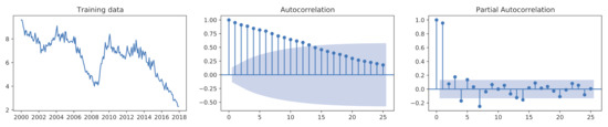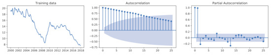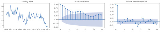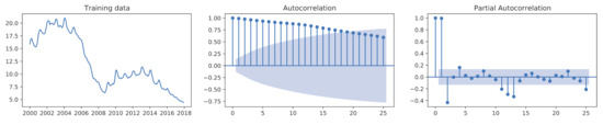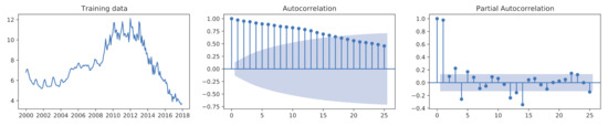 Starting with the training dataset, we generated Figure 2, Figure 3, Figure 4, Figure 5, Figure 6 and Figure 7 that show a visual review of training datasets for the unemployment rate for each country and its corresponding Auto Correlation Function (ACF) and Partial Auto Correlation Function (PACF) plots.