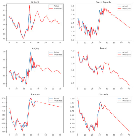 In our study we implemented the ARIMA model fitting the unemployment rate data for an 18 year span in six European countries (Bulgaria, Czechia, Hungary, Poland, Romania and Slovakia) and then we tested the model for the next 3 years (2018–2020). The next step was to apply the linear regression model to obtain the mathematical formula for the connection between unemployment rate (UR) and PRPSE and SPLS, respectively.