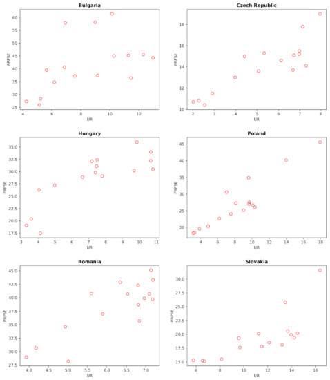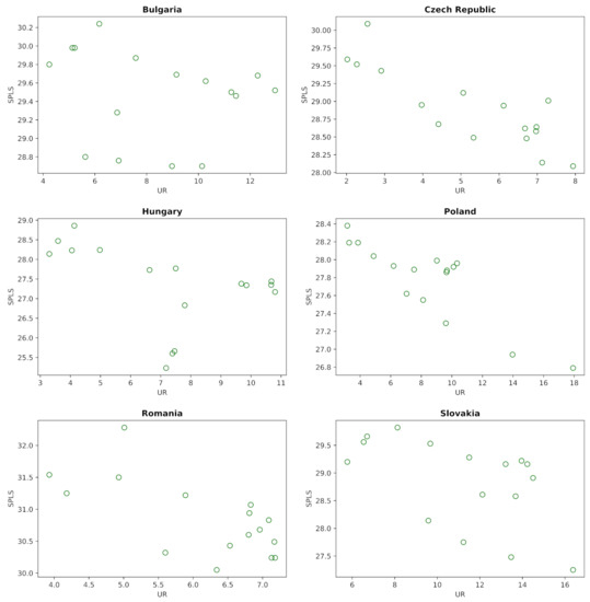From Figure 9, one can notice that there is a positive slope between PRPSE and UR, meaning that there is a positive linear correspondence for all six countries, while in Figure 10 one can notice a negative slope between SPLS and UR, which means there is a negative linear relationship for Czechia, Poland, Romania and Slovakia but it is less clear for Bulgaria and Hungary. For those countries where the relation is significant, as the UR increases, the PRPSE also increases and the SPLS decreases.