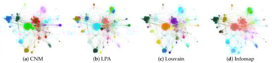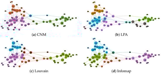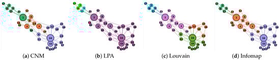 Figure 1. It is interesting to analyze the subtle differences between these communities. The colors used for plot correspond to the community ID. It is important that visible structural differences can be observed, even on this moderately small network. CNM seems to yield a good community structure, however, the central red region is dispersed, which could be split into three different communities (this may be explained by the nature of the algorithm to merge two clusters—adjusting the parameter of the dendrogram cut will influence the final community structure). Furthermore, there are some outlier nodes, e.g., the red node in the leftmost blue region. The LPA solves the separation of the aforementioned central red community, but, there are cases where such separation may not be justified, e.g., the leftmost region, or the top right green and blue communities—again, this may be fine-tuned by varying the voting algorithm. Infomap yields the smallest number of communities, which can be seen on the plot, too, having many separate groups with the same color, i.e., community ID—the explanation may lie in the fact that the for small communities, the length of the Huffman coded path will not be any smaller by splitting these groups (the size of the communities together does not result in longer Huffman codes per node), on the contrary, it may become longer since a new entrance and exit code must be added to the path. Finally, Louvain communities seem to capture the network’s community structure in the best possible way, with clear separations, but not in a excessive manner, as in the many cases of LPA.