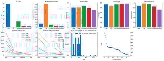Figure 1. Regarding modularity, coverage and performance scores, we can state that the custom partition-based Infomap does not outperform the simple one—quite on the contrary. The second row of plots show two line plots, each having five series according to the different algorithms, and two other plots to represent the community size histogram of Louvain. The first line series show max., average, median and min. size of the communities, while the second plot shows the same stats referring to their densities. We can observe that LPA produces the most dense communities, which can be justified by the larger number of communities, a more thorough separation of the nodes. These values originate from one evaluation—although these algorithms are non-deterministic, except the CNM, results across different runs showed insignificant, slightly observable differences.