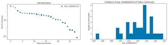 Figure 5 shows a scatter plot of the community sizes, scaled by their hub dominance score. It can be observed that the smaller the community, the larger the hub dominance, naturally. Cases where a large community has a large hub dominance are interesting scenarios, probably meaning the existence of important nodes inside the community. Similarly, the communities’ node embeddedness histogram can be seen on the rightmost plot, demonstrating that this network’s community structure results in highly embedded nodes, their degrees consisting of mostly inner connections of the community.