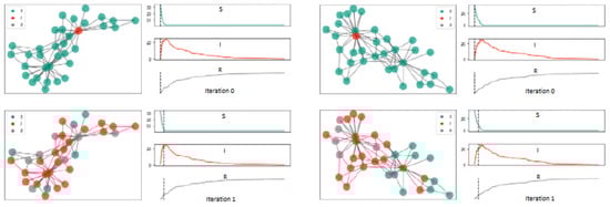 Figure 7 only depicts the first iterations to illustrate how the information spreads from the initial infected nodes to the other nodes. These empirical results have been obtained for a particular SIR model with the probability of 0.2 for an infected node to infect its neighbors and a recovery rate of 1.2. We can note that, if we compare every frame between the two nodes, they are both confirmed as important nodes in this small network; however, a deep statistical validation is still required in order to assess the importance of high ranked centrality nodes and hub dominant ones, further taking into account the stochastic nature of the spreading models.