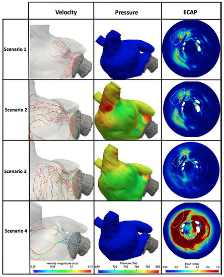 Scenario 1 delivered pressure values from −100 Pa (−0.75 mmHg) to 300 Pa (2.25 mmHg), which were substantially lower than the ones measured with invasive catheters, which ranged from 6 mmHg to 12 mmHg. In addition, the simulated mean pressure gradient between the PV and MV was of 190 Pa (1.43 mmHg), being much higher than those acquired in the clinical setup (between 0.07 mmHg and 0.5 mmHg). Velocity magnitudes were within the physiological range, with blood flow patterns (see Figure 2) qualitatively simpler than in other scenarios, without obvious recirculations despite the clinical evidence of DRT. Pressure values were homogeneous in the whole LA. The highest values of ECAP (i.e., linked to higher thrombogenic risk) were obtained at the LAAO device’s surface, at the upper part, near the pulmonary ridge.